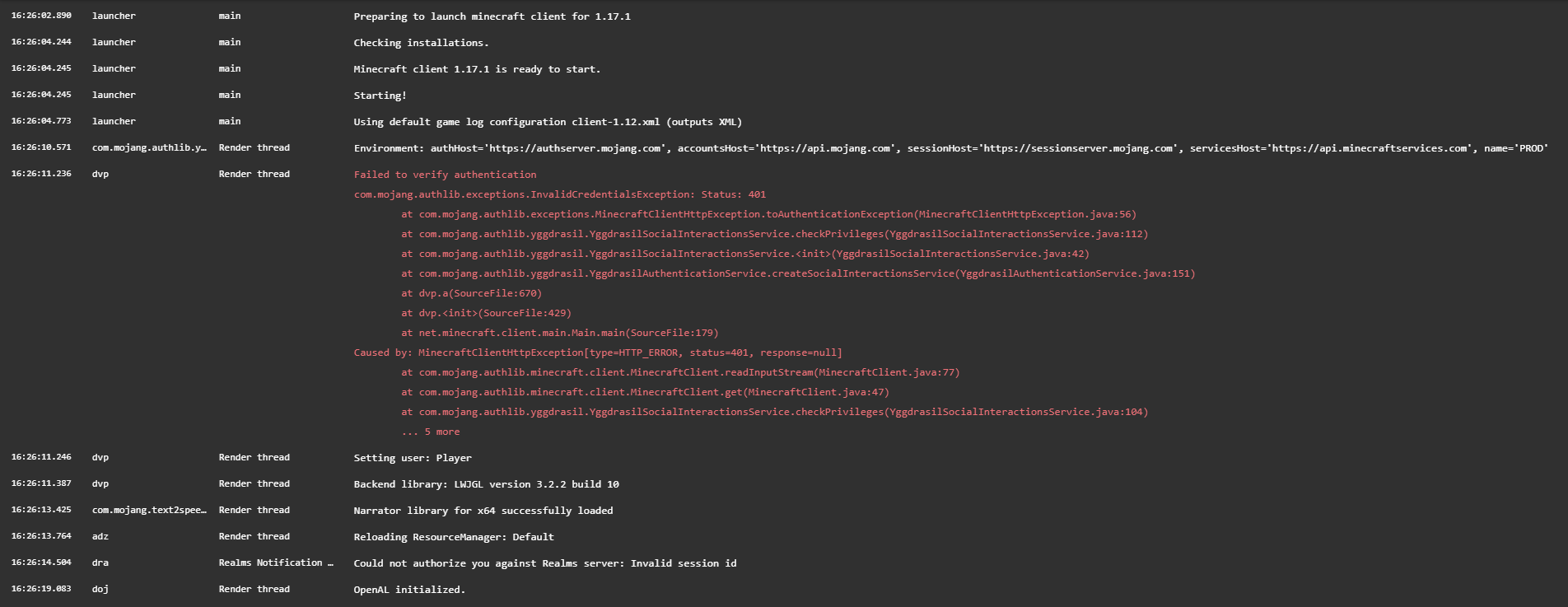 Failed to verify authentication com.mojang.authlib.exceptions.InvalidCredentialsException: Status: 401 at com.mojang.authlib.exceptions.MinecraftClientHttpException.toAuthenticationException(MinecraftClientHttpException.java:56) at com.mojang.authlib.yggdrasil.YggdrasilSocialInteractionsService.checkPrivileges(YggdrasilSocialInteractionsService.java:112) at com.mojang.authlib.yggdrasil.YggdrasilSocialInteractionsService.<init>(YggdrasilSocialInteractionsService.java:42) at com.mojang.authlib.yggdrasil.YggdrasilAuthenticationService.createSocialInteractionsService(YggdrasilAuthenticationService.java:151) at dvp.a(SourceFile:670) at dvp.<init>(SourceFile:429) at net.minecraft.client.main.Main.main(SourceFile:179) Caused by: MinecraftClientHttpException[type=HTTP_ERROR, status=401, response=null] at com.mojang.authlib.minecraft.client.MinecraftClient.readInputStream(MinecraftClient.java:77) at com.mojang.authlib.minecraft.client.MinecraftClient.get(MinecraftClient.java:47) at com.mojang.authlib.yggdrasil.YggdrasilSocialInteractionsService.checkPrivileges(YggdrasilSocialInteractionsService.java:104) ... 5 more