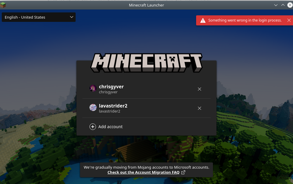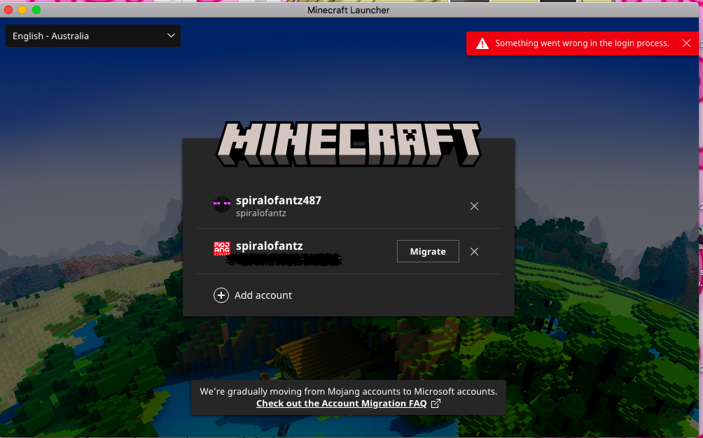 "Something went wrong with the login process." It's back again, upon trying to log into a Microsoft Account either by clicking the button to do so or by trying to use an already-logged-in account. I'm on MacOSX 10.11.6. This would happen far less often if we could rollback launcher updates instead of being stuck with the latest version (it's especially an issue with the automatic updates).