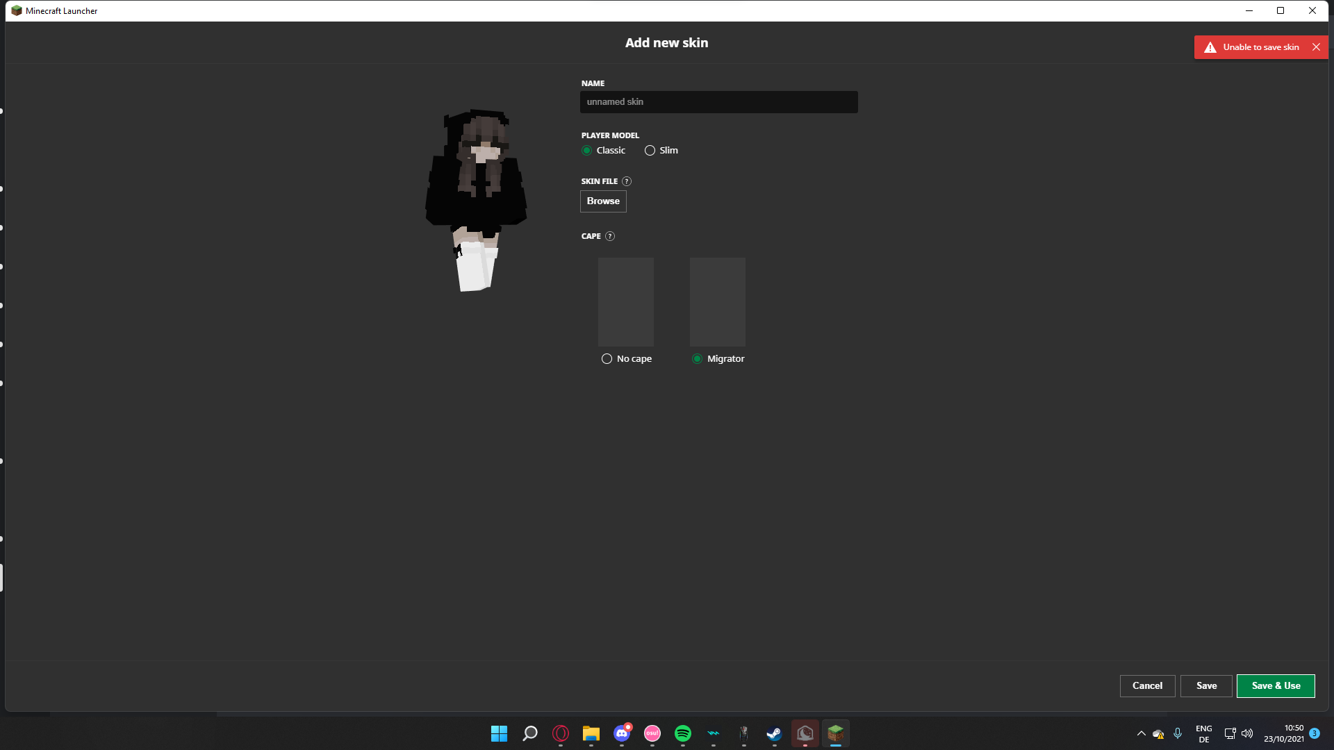 As stated in the title, I cannot save my skin on the Minecraft Launcher. The only workaround for this currently is, either updating my skin via the website, or reinstalling the launcher everytime I wanna play with my skin on servers.