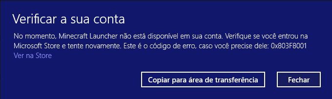 No momento, Minecraft Launcher não está disponível em sua conta. Verifique se você entrou na Microsoft Store e tente novamente. Este é o código de erro, caso você precise dele: 0x803F8001