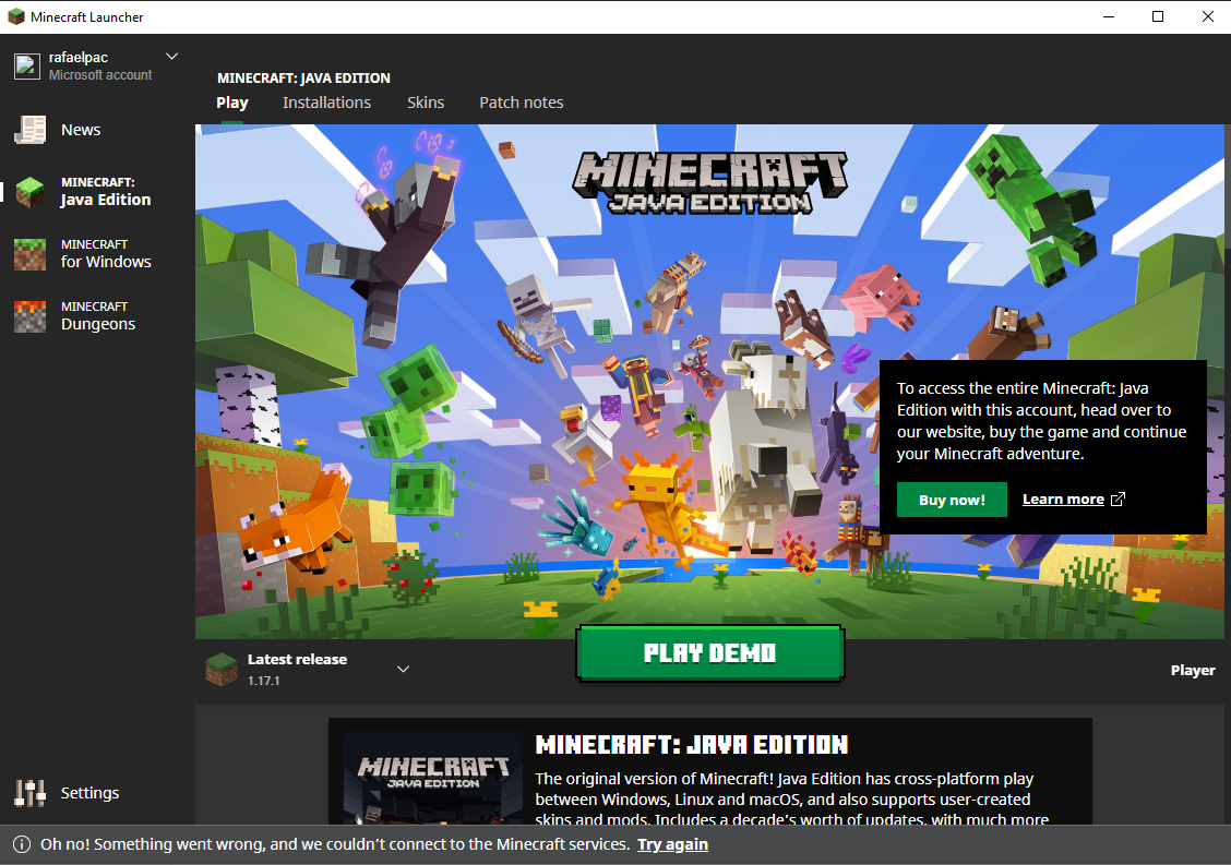 oh no something went wrong and we couldn't connect to the Minecraft services