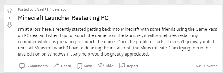 And when I tried to run the new launcher downloaded from the Minecraft.net, the launcher doesn't open, I was only able to open the launcher when I downloaded it from the Microsoft Store and the game worked normally, but today when I tried to start it (twice) my PC restarted.