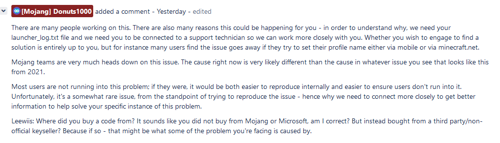 Does that means there no Mojang employee working to find out how to fix this big of a problem? I have not seen a bug in this bug reporting web with this many upvotes and still with many people apporting information and all the files required for them to fix the issue, this issue was first registered at 2021. And we still can't have a game we've have legitimately bought. Just imagine buying a game and not be able to play, spending those savings of you to play that fun game with your family or friends with a great hype, and then find out that you can't create your username and that restrict you from playing, then find out that it's not your fault, we are doing nothing wrong and there's many other people with this same issue!