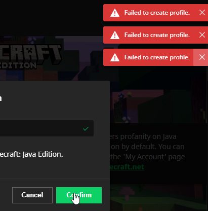 I have the Microsoft Version so it gave me Java version for free with it and when i try to make a profile name it gives me same errors as above i even tried from website where i put name click the thing but nothing happens and it also shows if username is taken or not it just won't allow creating a new one