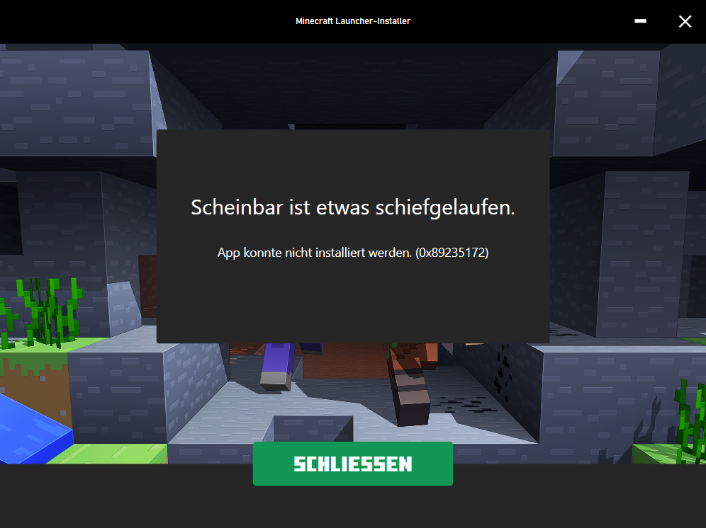 I bought Minecraft Java Edition and wanted to download it on Minecraft.net . I could login and all that stuff and when i clicked on download to install the minecraftinstaller.exe it was fully downloaded. When i wanted to start it i had to accept some stuff and then i clicked on install. But when the download started there isntantly came up the error 0x89235172 . I reinstalled the installer, restarted my laptop and tried it on another day. It still didnt work. Please help me!