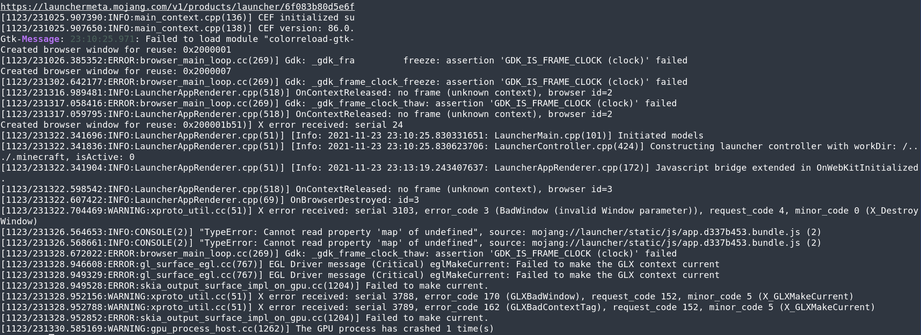 [1123/231326.564653:INFO:CONSOLE(2)] "TypeError: Cannot read property 'map' of undefined", source: mojang://launcher/static/js/app.d337b453.bundle.js (2)
