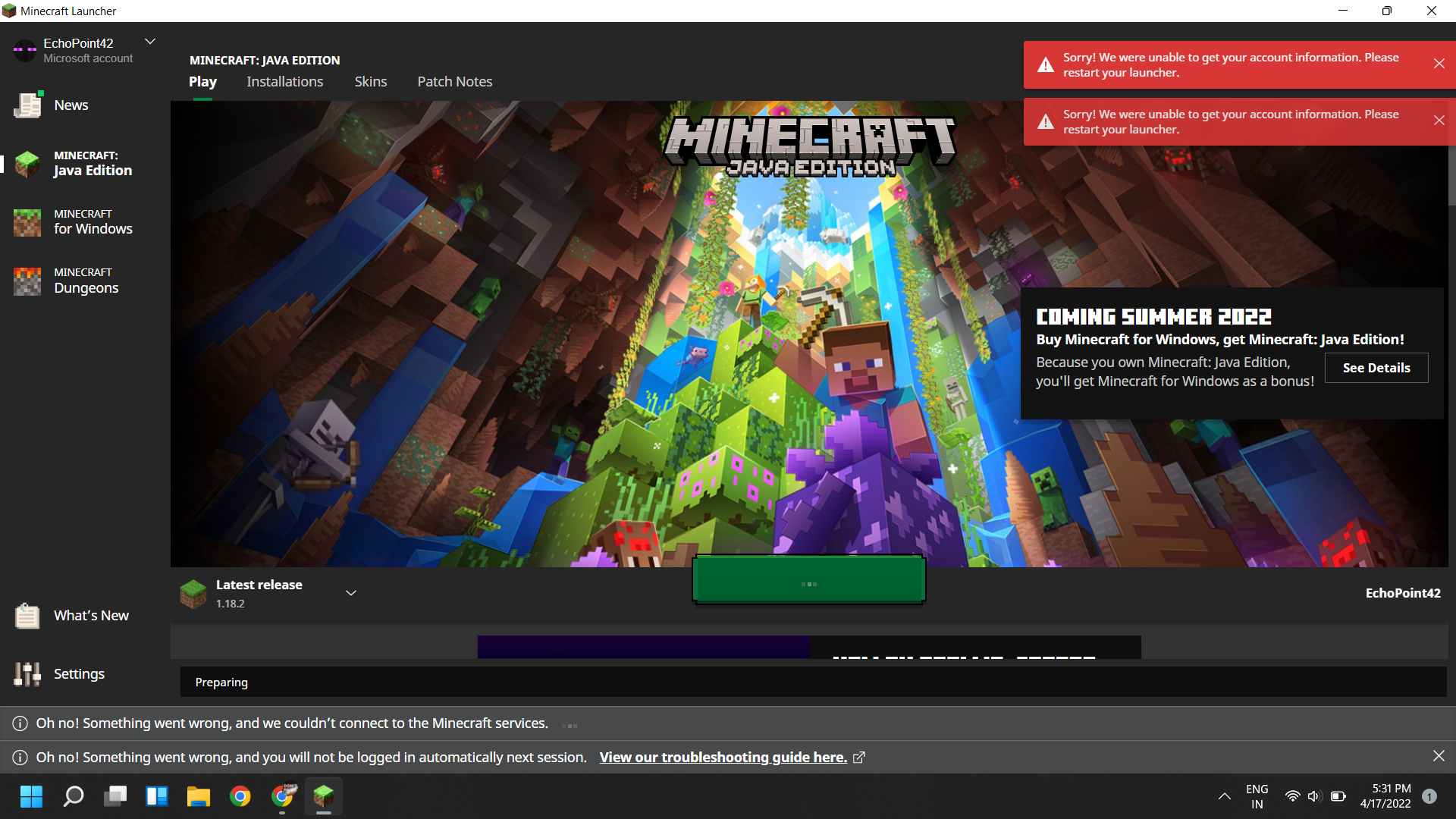 Moreover, a lot of the times when I open the launcher it shows a message in the top right: "Sorry! We were unable to get your account information. Please restart your launcher."