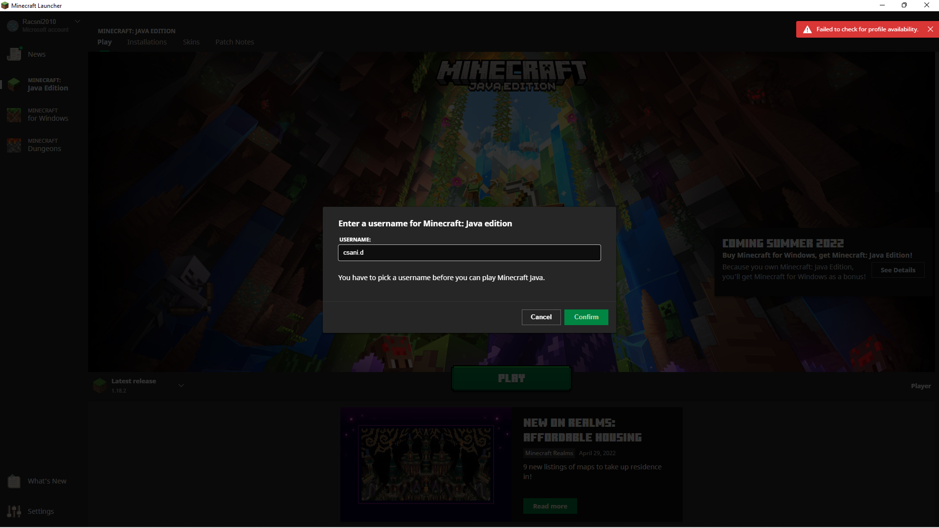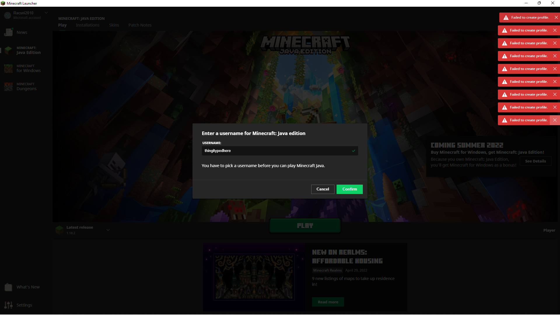 I pressed 'confirmed' after typing in my username and nothing happened, but a red sigh popped up in the top right corner saying "failed to create profile". I got another error sign too, it says "failed to check for profile availability" the only thing i can do with it is to cross is out.