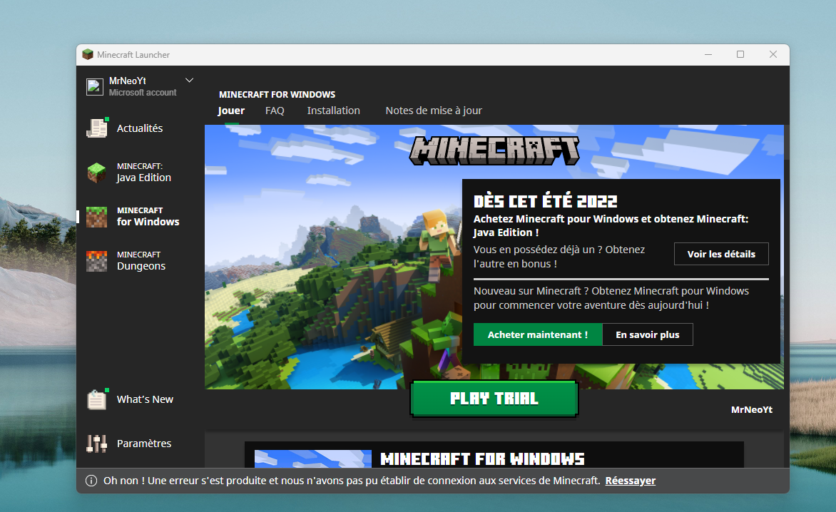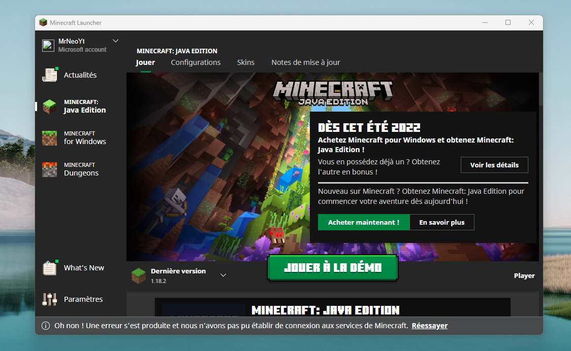 The launcher does not want to connect to the internet the login is done correctly but it says that it is only possible to play the demo version of Minecraft java and Windows edition... Internet connection tested and verified, it comes from the launcher!