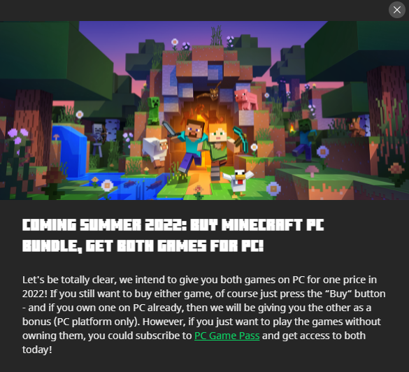 "COMMING SUMMER 2022: BUY MINECRAFT PC BUNDLE, GET BOTH GAMES FOR PC!" is harder to read than this text: