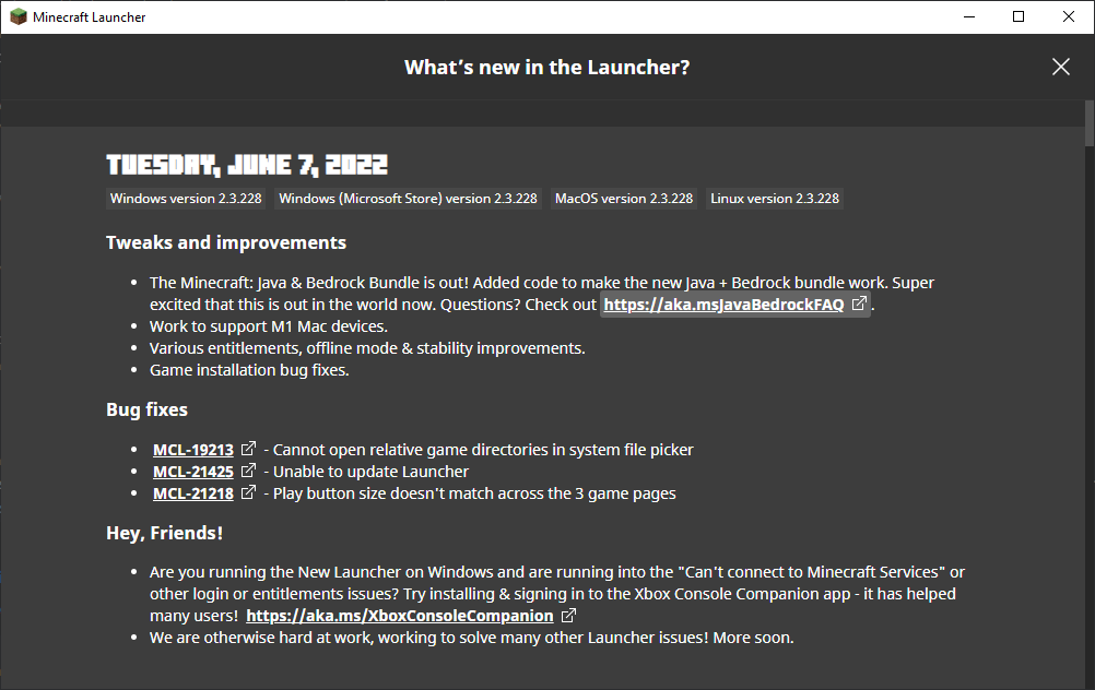 The Minecraft: Java & Bedrock Bundle is out! Added code to make the new Java + Bedrock bundle work. Super excited that this is out in the world now. Questions? Check out https://aka.msJavaBedrockFAQ.As it appears, "https://aka.msJavaBedrockFAQ" simply directs to https://aka.msJavaBedrockFAQ, an invalid and incorrect webpage.