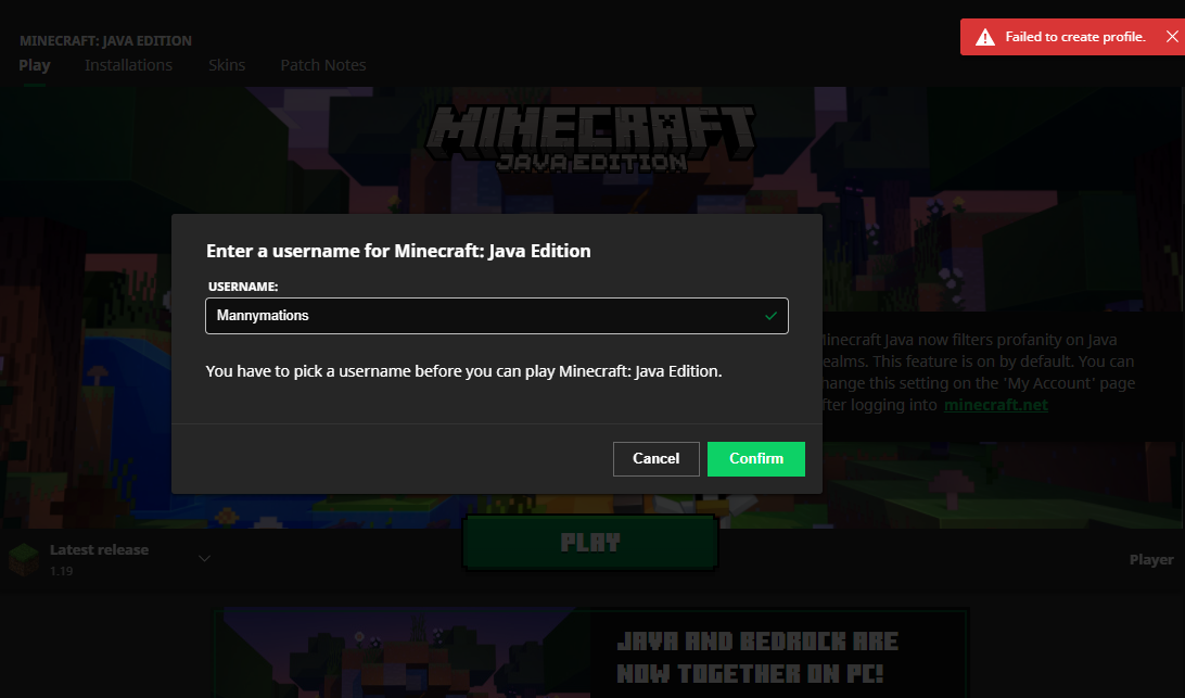 I opened the Minecraft version to play, Then I created a username (first time playing) and then I try to log into Java again and it says I need a username but when I put one in it says "Failed to create profile"