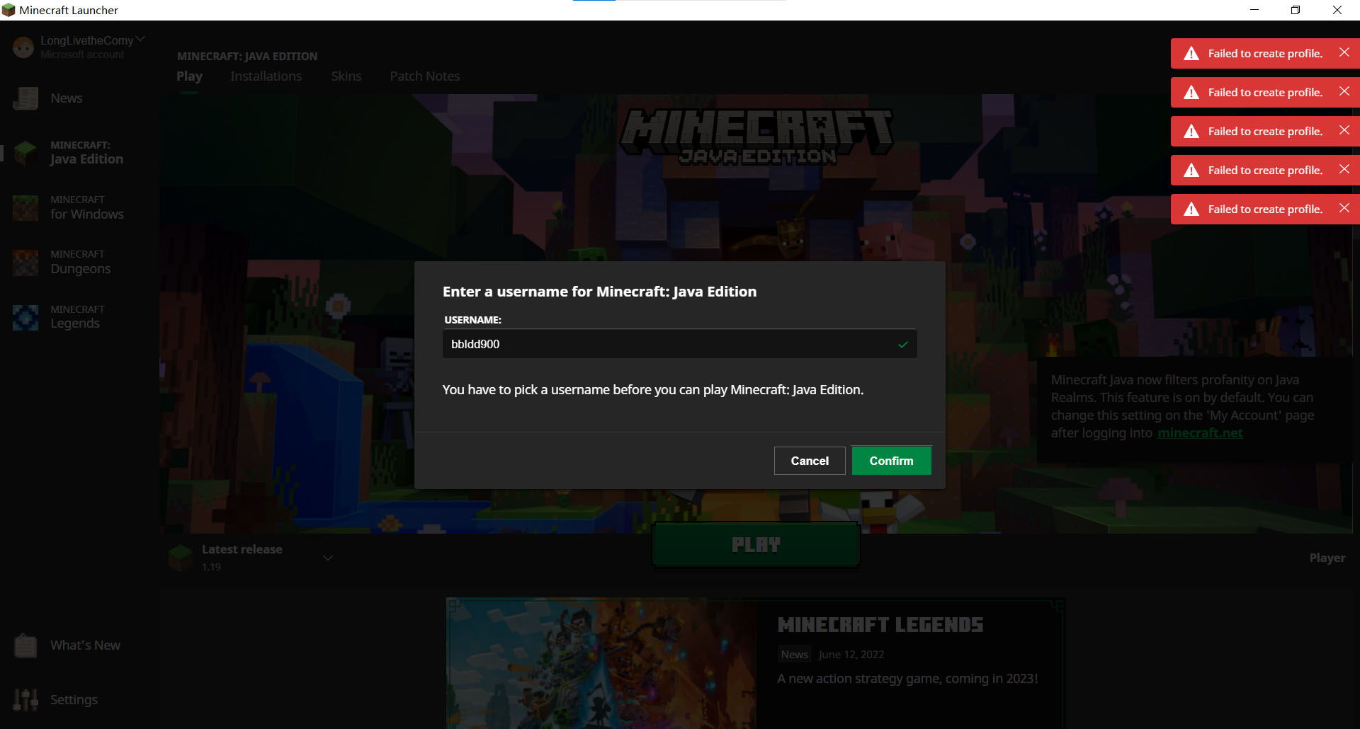 Yesterday, the problem seemed more strange—it seems I already have the Java Edition as the “Play the Demo” button in Minecraft Launcher have turned into “Play”. When I clicked the “Play” button and entered my username to create a profile, an error just occurred: “Failed to create profile”. (shown in pic 2) When I logged in at https://www.minecraft.net/en-us/msaprofile , the button under Minecraft Java Edition was “Buy now” (shown in pic 3), which seemed I actually don’t have the Java Edition. So, the reason I cannot create profile might be: the information in website and launcher was out of sync.