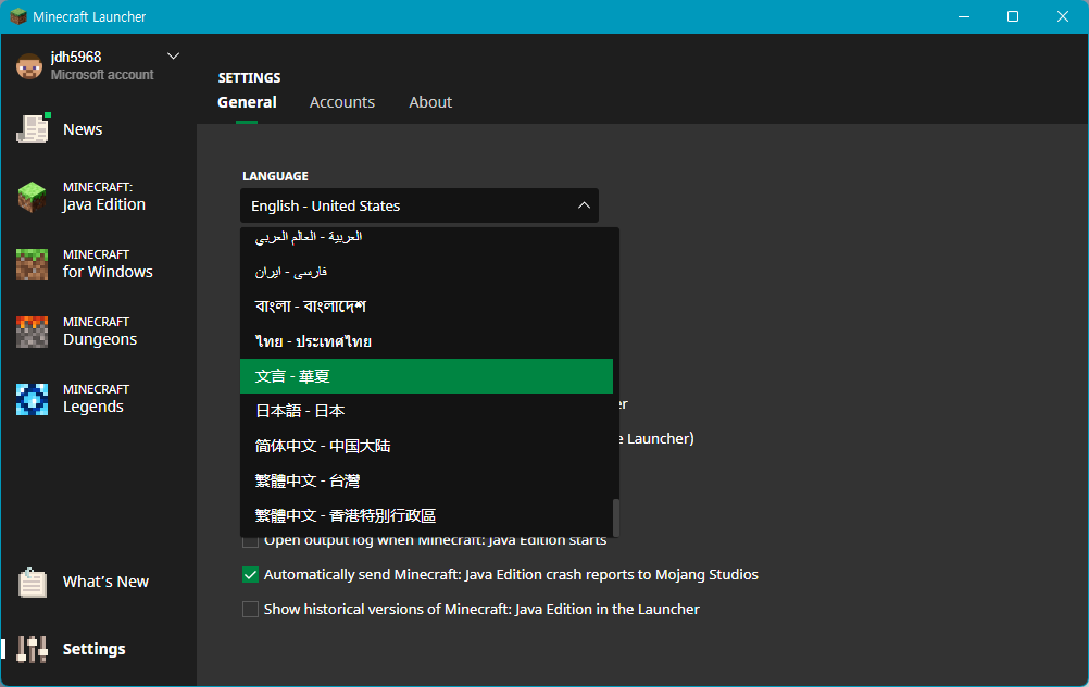 The "Korean - South Korea(한국어 - 한국)" is missing on the launcher settings.