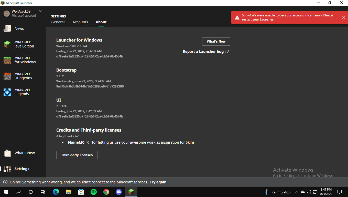 When I open Minecraft launcher it's only show play offline or play demo in bedrock it's play trial, I have stable connection but when I go to accounts it's said that no connection, and sometimes this appears