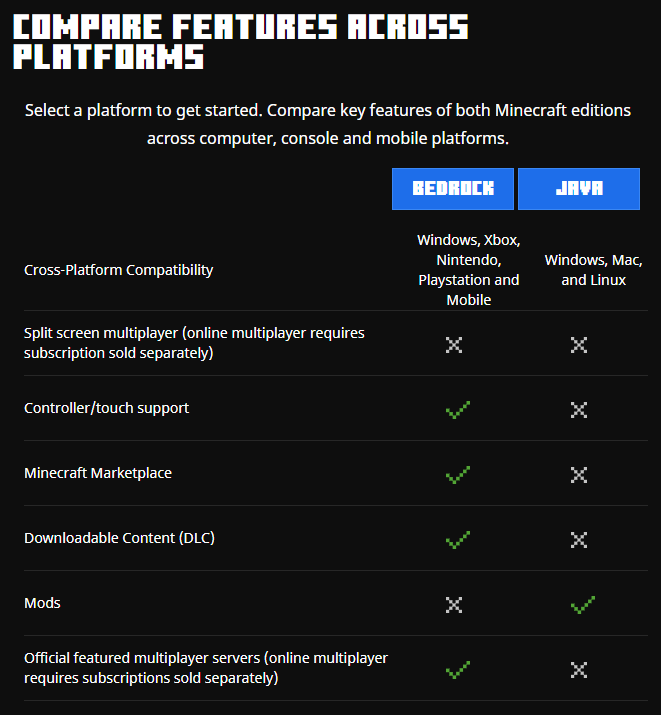 The "BEDROCK" and the "JAVA" tabs in the "Compare features across platforms" section under the "Minecraft for Windows" tab are not fully aligned with the table underneath. Please refer to the screenshot.