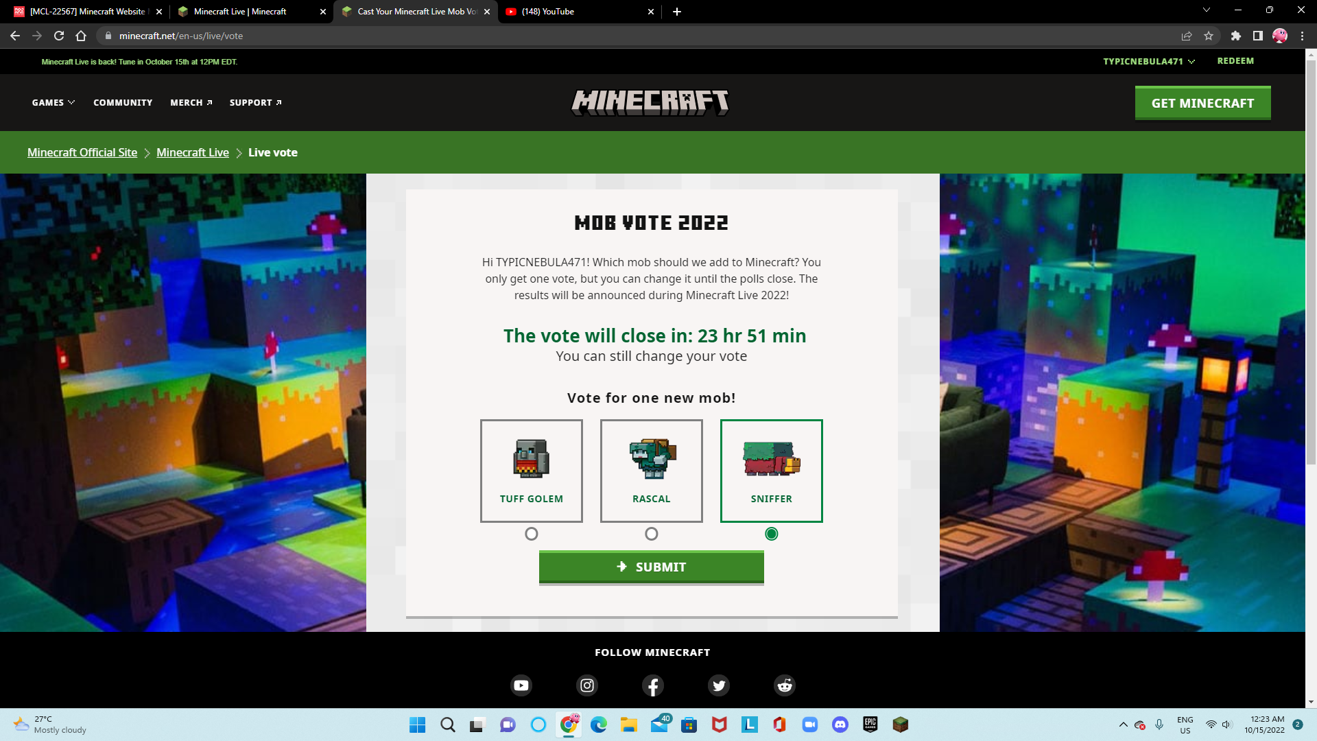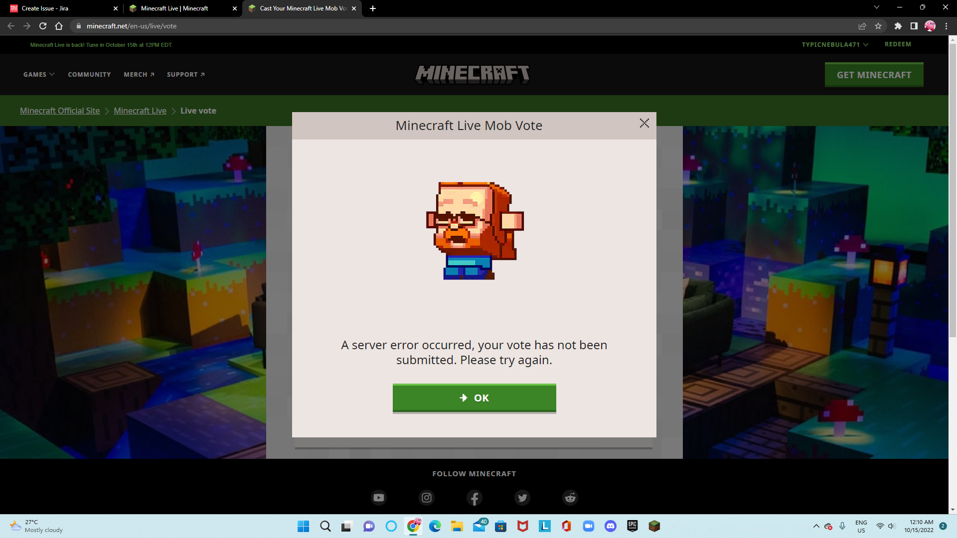 So.. I was trying to vote for a new mob in Minecraft Website, but it didn't work. May I wonder know what's the issue? Or its just a bug? If it doesn't work, should I use bedrock edition instead? I need to vote right now before Minecraft Live started. If it almost time, I should use bedrock edition instead. Is anyone has that same problem? Or is it just me? I don't know what to said to that error.