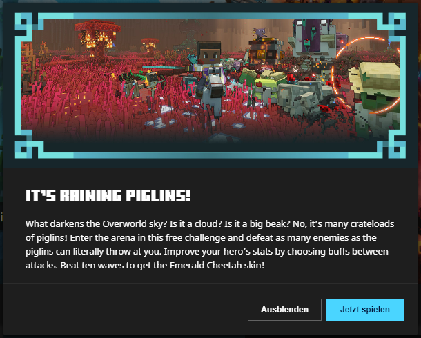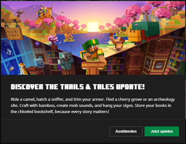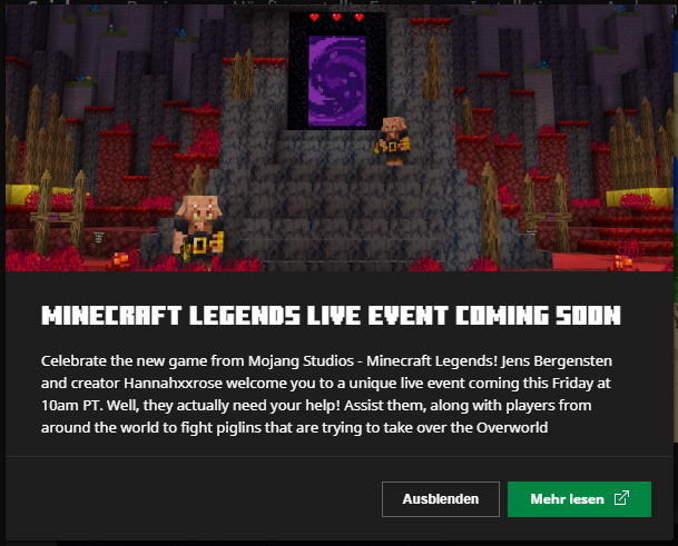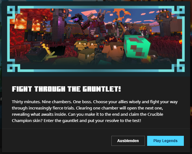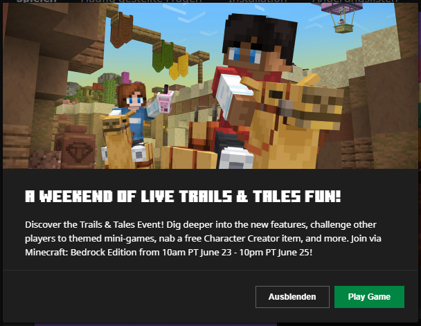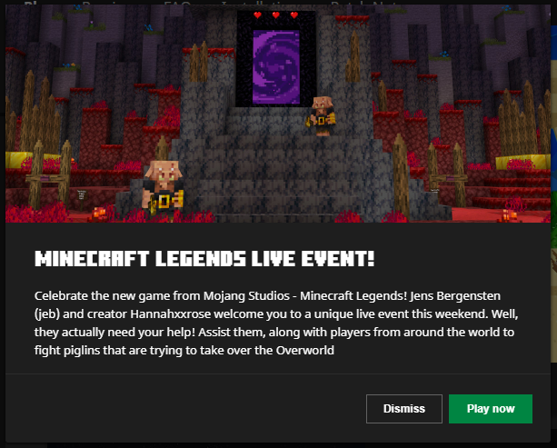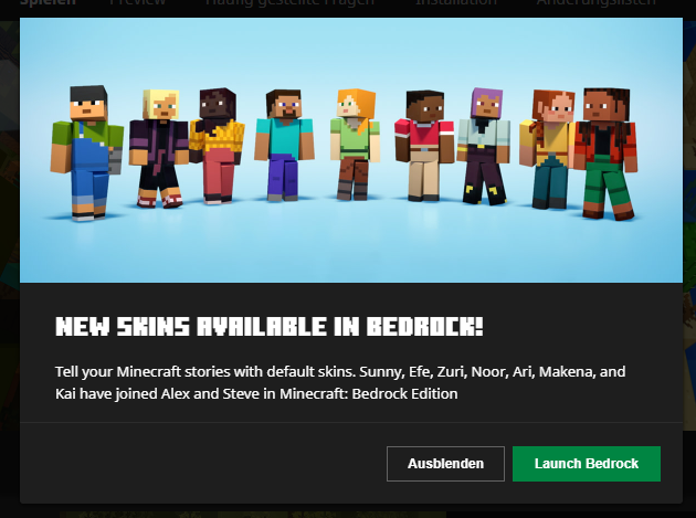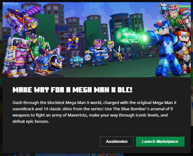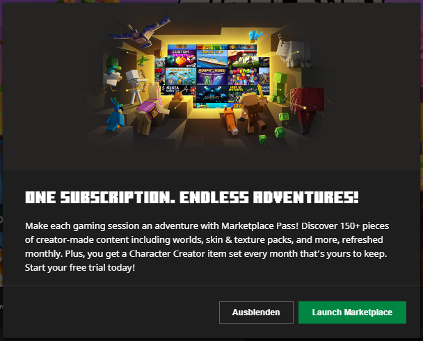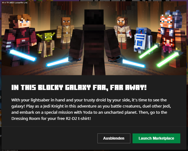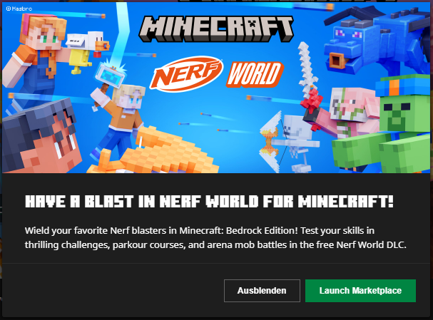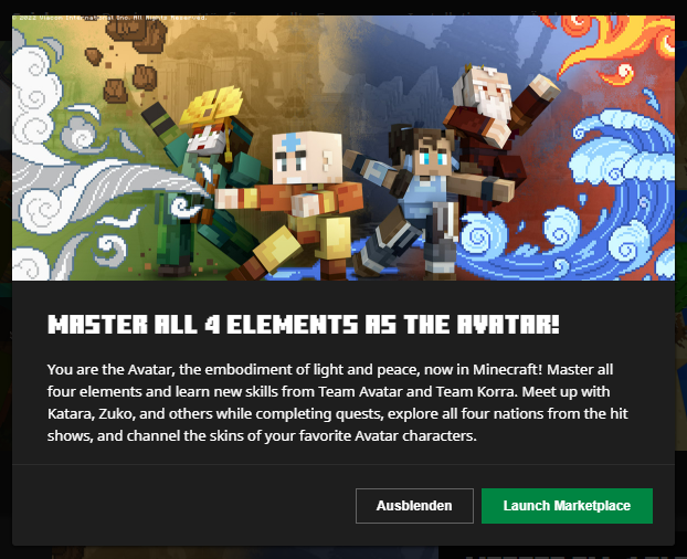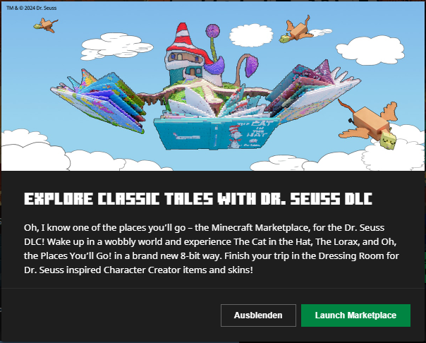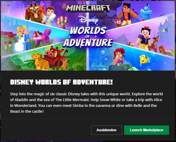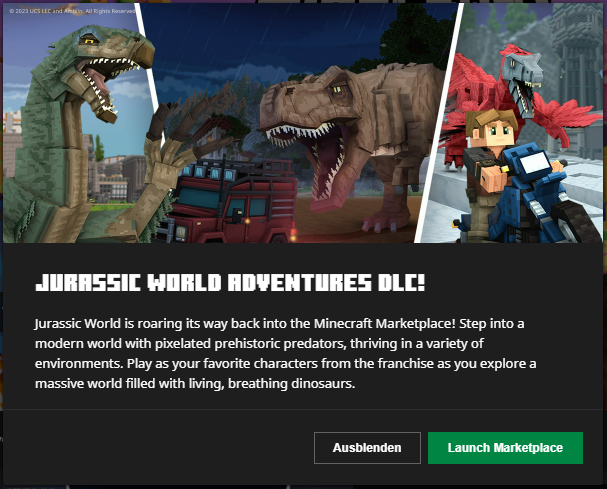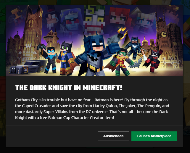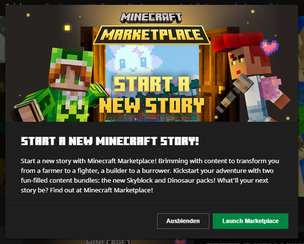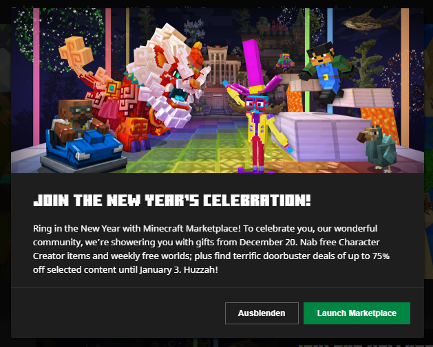 Recurring short-term promotional content in the Minecraft: Java Edition, Minecraft for Windows or Minecraft Legends tab, including buttons such as "Launch Marketplace" (or "Launch Bedrock"), are not translatable.