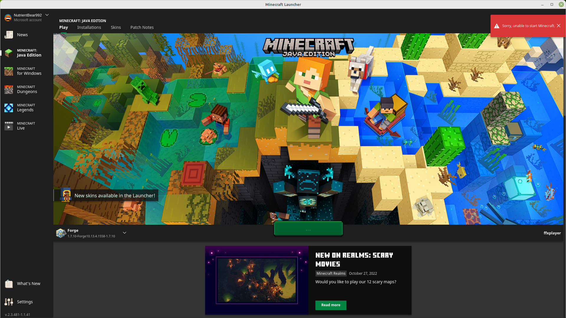 What actually happened was...: I logged in, logged out and logged in again. I clicked the green play button. The immediate reaction was to get a big red banner in the upper right corner that said Minecraft is unable to launch—changing to the most recent release does nothing.