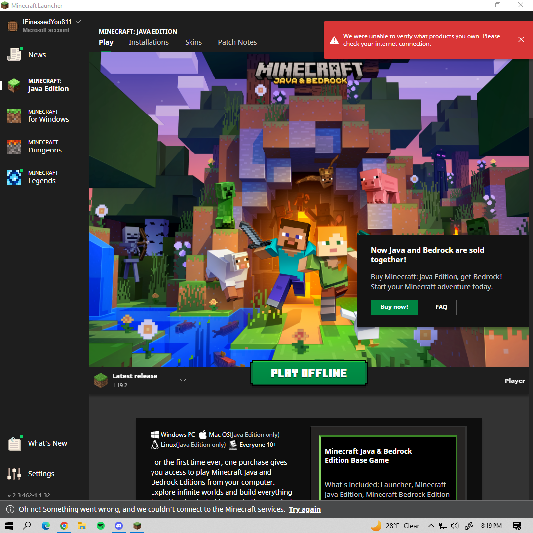 I already own the game but it also tells me to rebuy it which I do not understand ive watched many videos on how to fix this ive changed my DNS and everything that videos have told me to do, I have also uninstalled minecraft like 5 times now unplugged my router and restarted my pc multiple times please help.