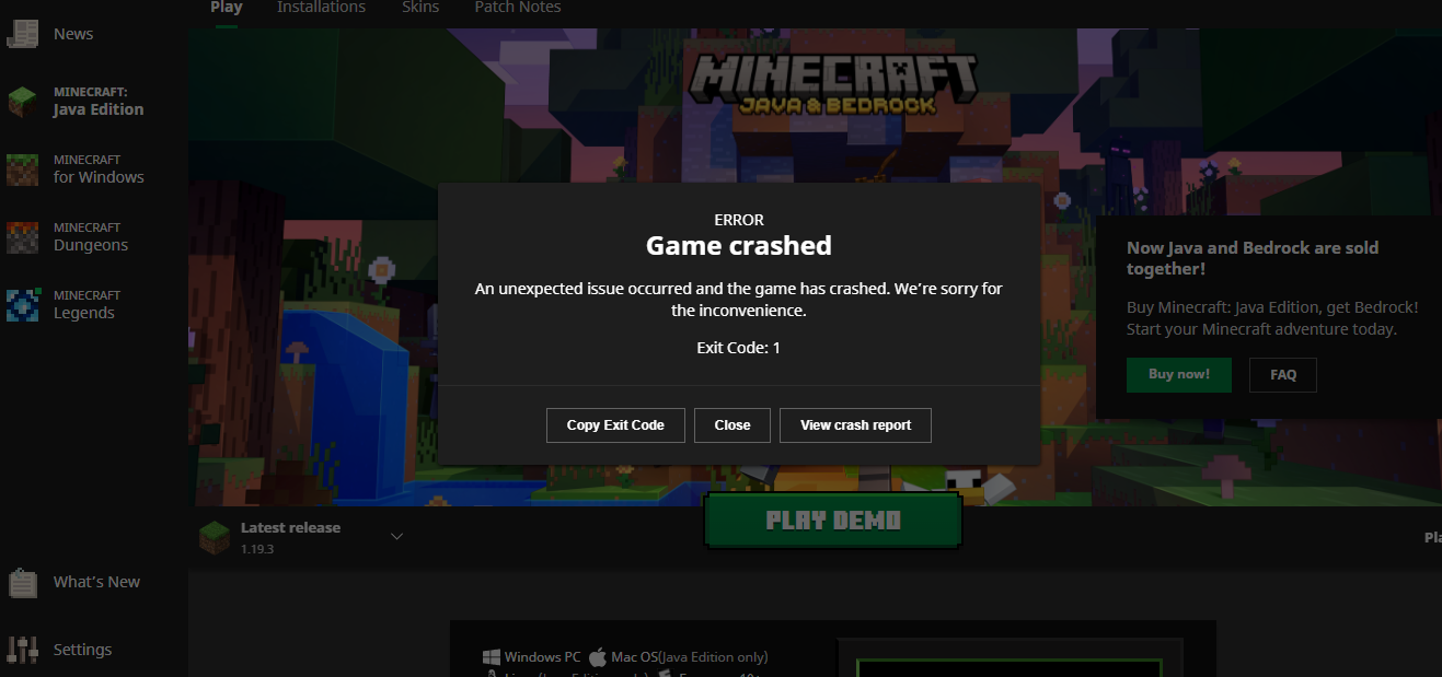 Dear Mojang, can you help me with this? I've downloaded the launcher and when I click the demo button, minecraft java won't open, and a crash report appears. Please help me. I'm on Windows 10. Thanks. You're the best.