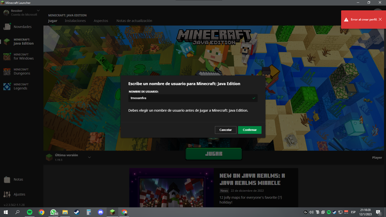 After they gave away Minecraft Java Edition to users who had Minecraft Bedrock, I was trying to play java edition, but every time I try to start it, it asks me to create a username (I already have a registered microsoft account) and when I put a password name tells me error when creating the profile name, this does not let me use java edition.