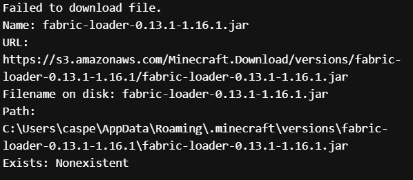 To get the URL of the missing file, we need to look at the error generated. After the error says "URL:", copy the entire path. Ex: https://resources.download.minecraft.net/aa/aa1d3aace1c481ac32d5827fba287294b6bc99fb.