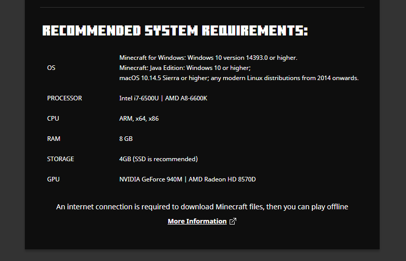 Two links with the text "More Information" are displayed within the Recommended System Requirements section for Minecraft: Java Edition.