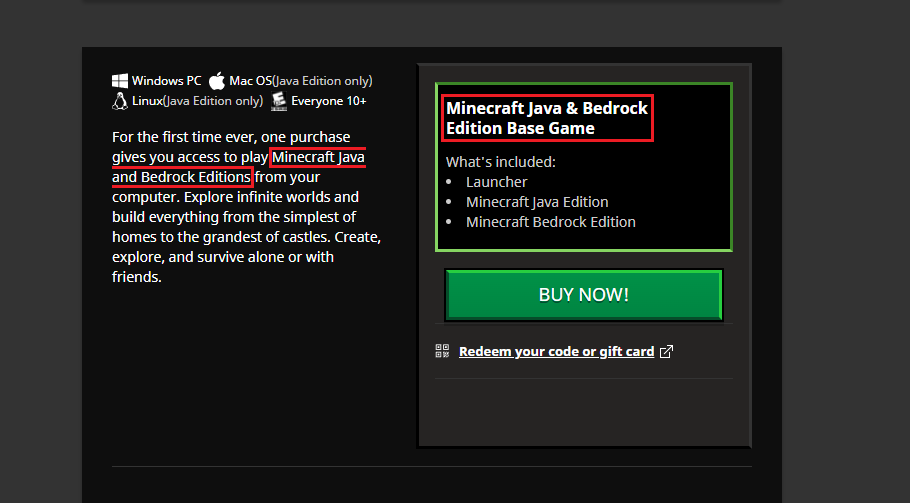For the first time ever, one purchase gives you access to play Minecraft Java and Bedrock Editions from your computer. Explore infinite worlds and build everything from the simplest of homes to the grandest of castles. Create, explore, and survive alone or with friends. | For the first time ever, one purchase gives you access to play Minecraft: Java and Bedrock Editions from your computer. Explore infinite worlds and build everything from the simplest of homes to the grandest of castles. Create, explore, and survive alone or with friends. | #: ..\..\apps\launcher\src\components\UpsellPDP\GameIntroduction\index.tsx:275 | https://crowdin.com/translate/minecraft-launcher/9420/en-de#5296094 |