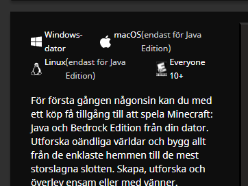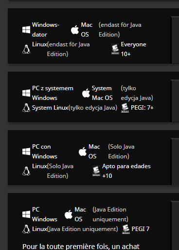 The text strings and icons for supported operating systems and age rating do not fit in properly within the upsell section for Minecraft: Java Edition when some languages are selected. The text is instead displayed across multiple lines, making it difficult for users to understand the information being presented.