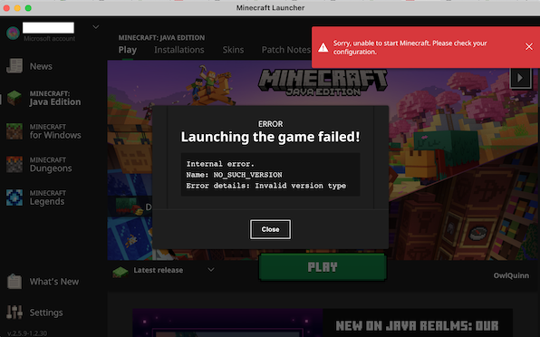 On a fresh installation of Minecraft Java Launcher on mac OSX (Mac OS Monterey 12.6.7) I observe no installations available in the "Installations" tab. When I click Play to play the latest release, I see a NO_SUCH_VERSION error.