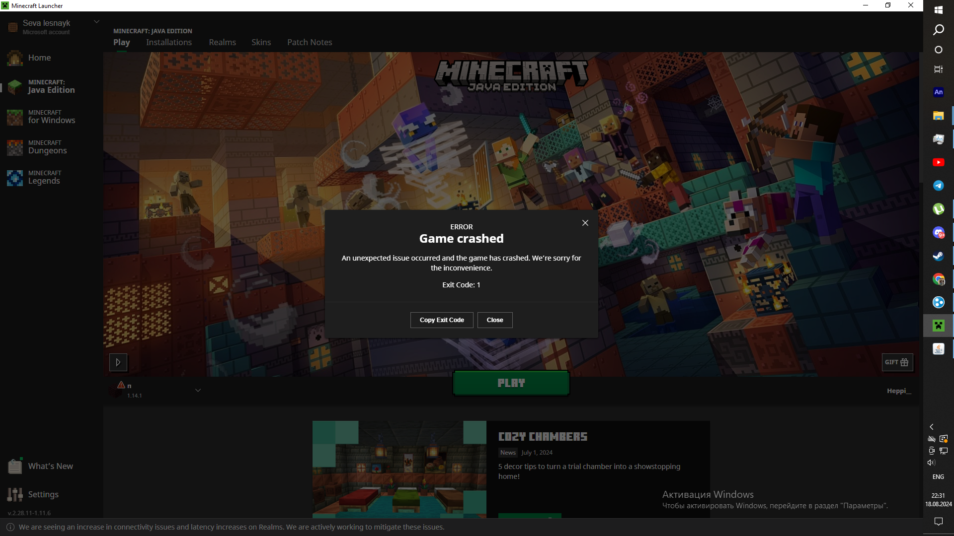 After the release of version 1.21, the Minecraft launcher stopped loading versions prior to 1.19. gives error code 1