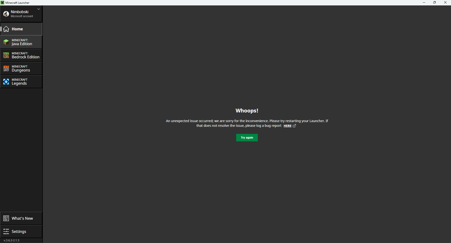 Minecraft Launcher is giving an issue: Whoops an unexpected error has occurred.
