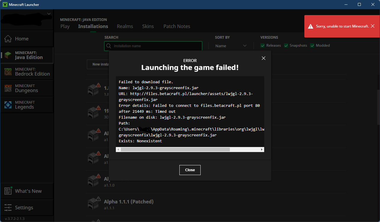 Error details: Failed to connect to files.betacraft.pl port 80 after 21597 ms: Timed out
