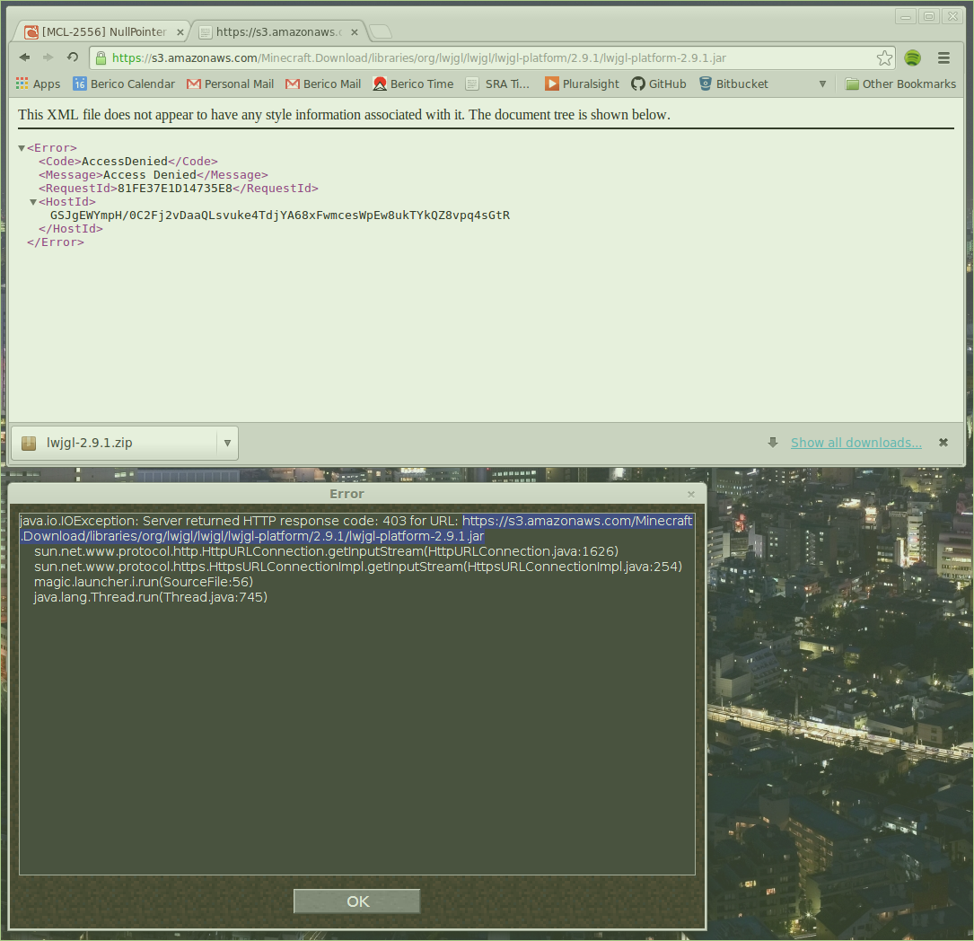 See attached screenshot of launcher failing to download LWJGL platform jar due to AWS S3 bucket denying access.