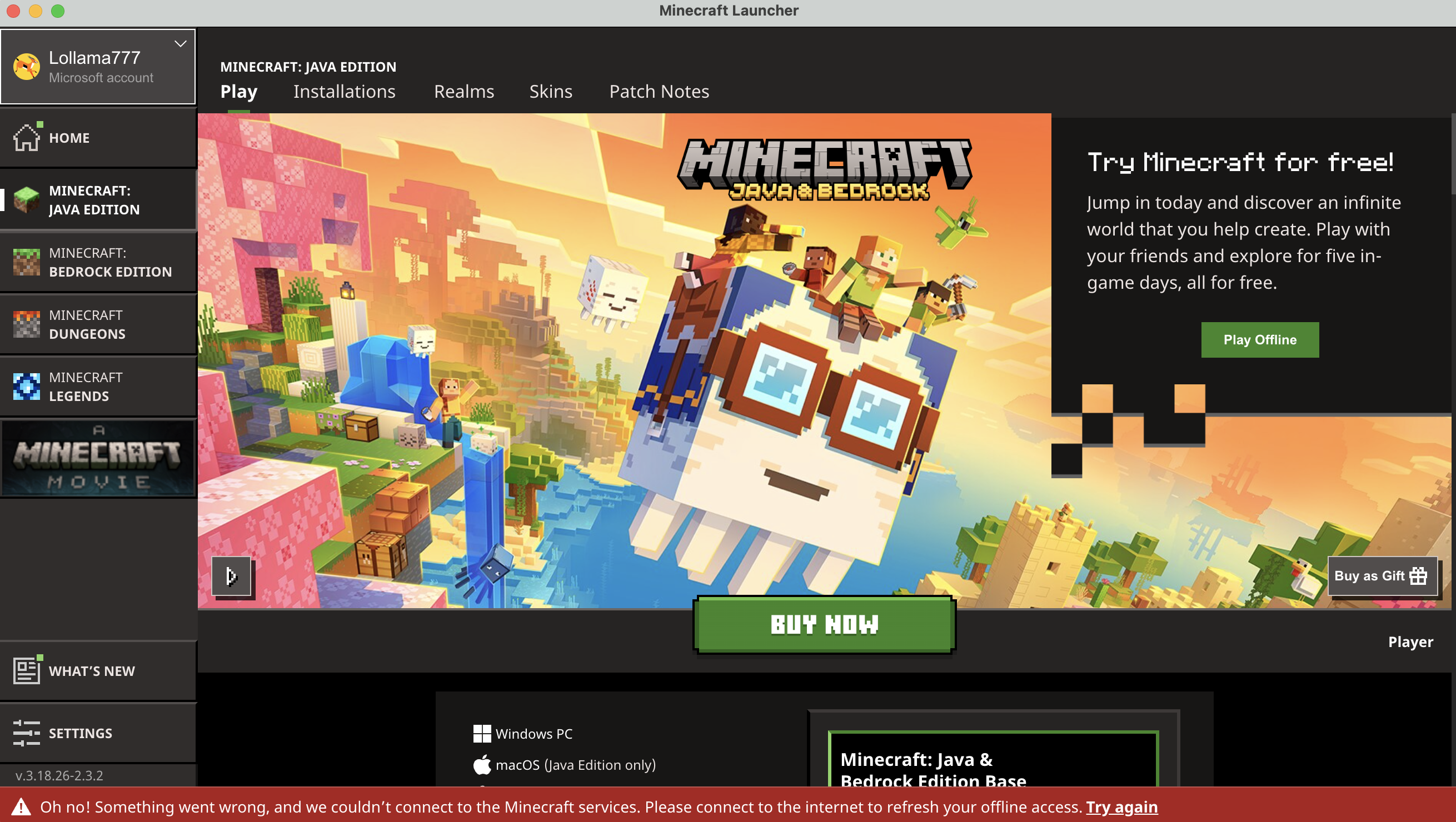 On the launcher, I log in with microsoft, click on my account and it is saying that it is unable to verify what i have purchased, EVEN THOUGH I HAVE PURCHASED STANDARD. On top of that, it is saying that I have to play offline, because my wifi isn't working, even though IT IS! It is really infuriating me, PLEASE FIX THIS.