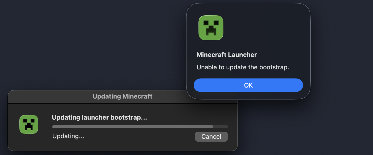 I ran the launcher, from the folder. It launched, and started updating and gave the logs shown above. Then as soon as it’s almost at the end, it says “Unable to update the bootstrap.” After this, the launcher got deleted by itself from the MacOS folder.