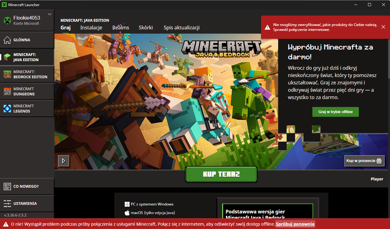Hello, I have a problem with the Minecraft launcher — I can’t enter the game because it shows a connection issue and a pop-up appears saying: “We couldn’t verify what products you own. Please check your internet connection,” even though I have purchased the product.