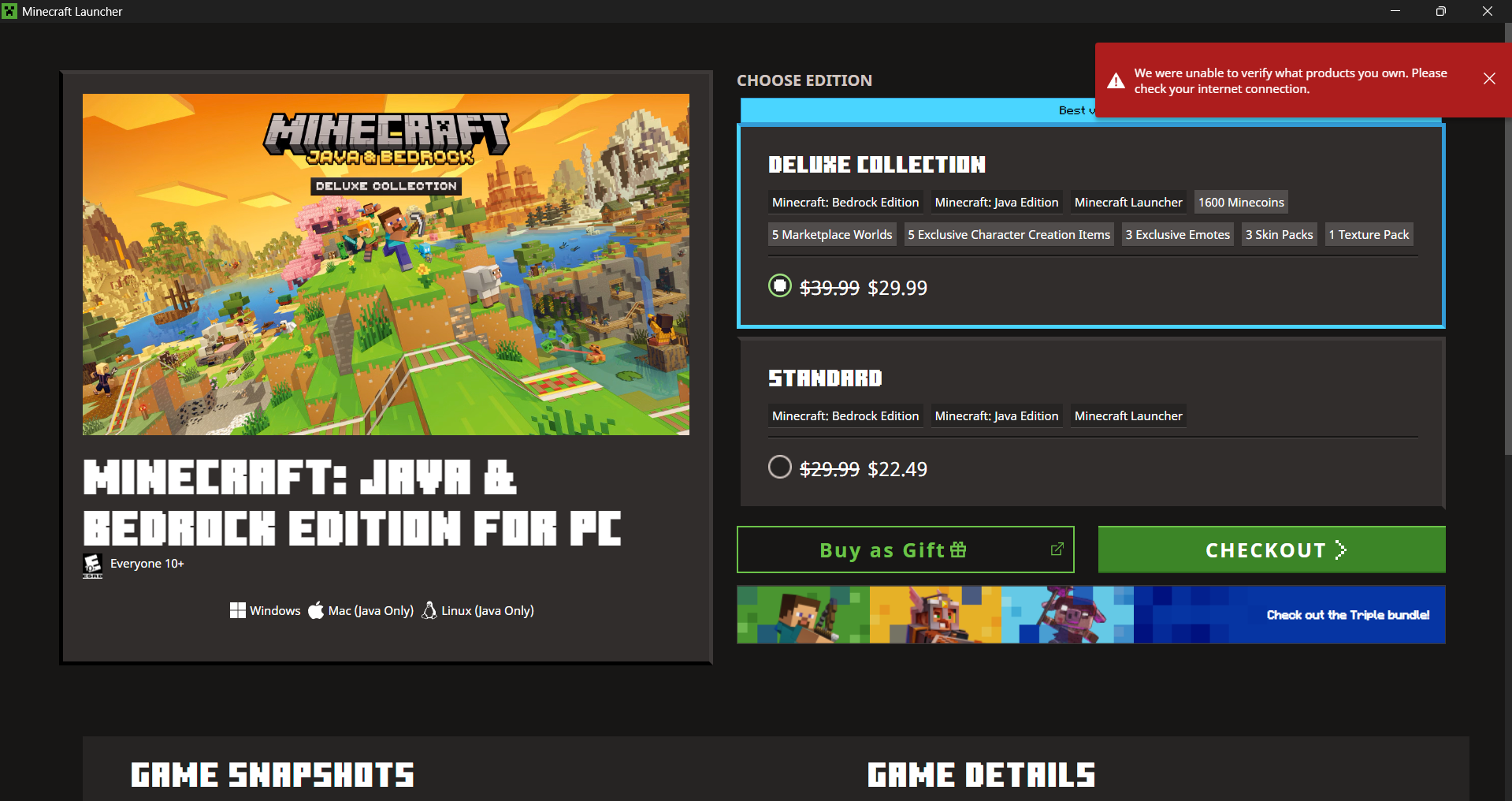 “We were unable to verify what products you own. Please check your internet connection.”