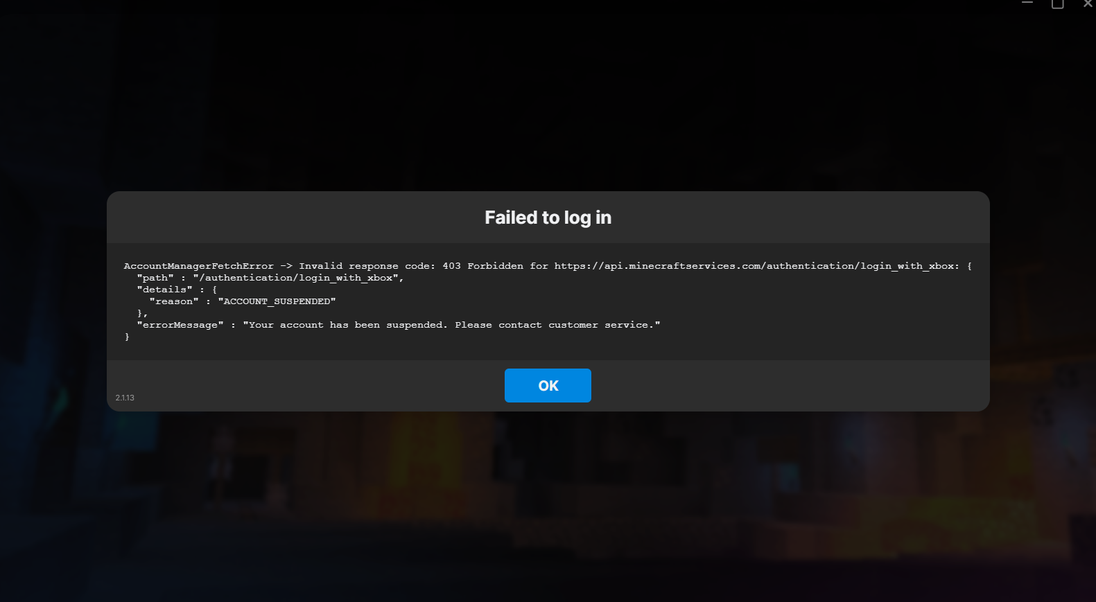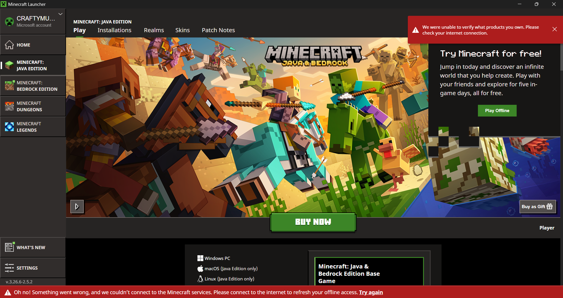 “Oh no! Something went wrong, and we couldn't connect to the Minecraft services. Please connect to the internet to refresh your offline access. Try again.”