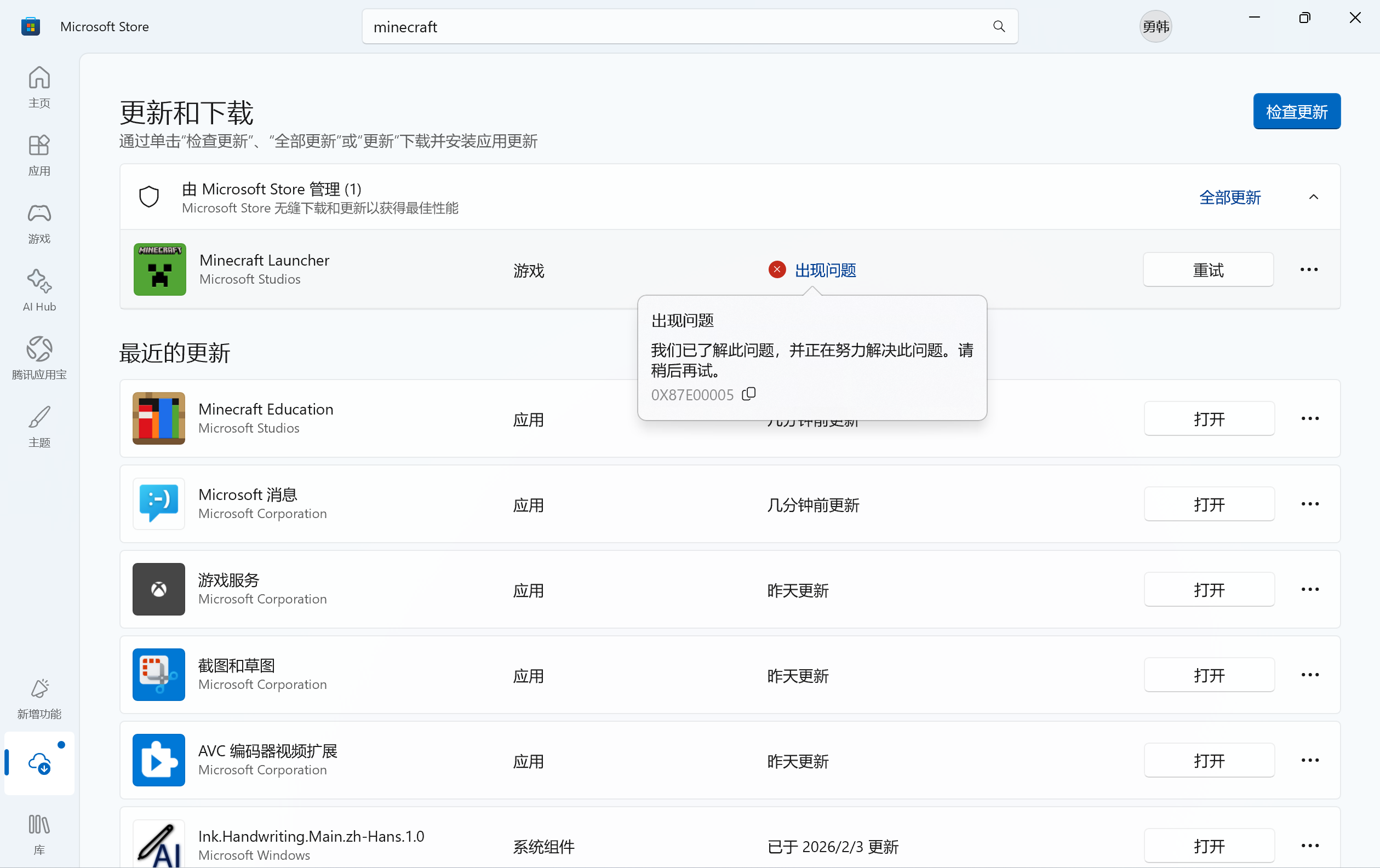 I encountered an error when trying to download the launcher from the Microsoft Store. I've tried many methods but still haven't been able to resolve it, so I'm seeking your help. Error code: 0x87e00005