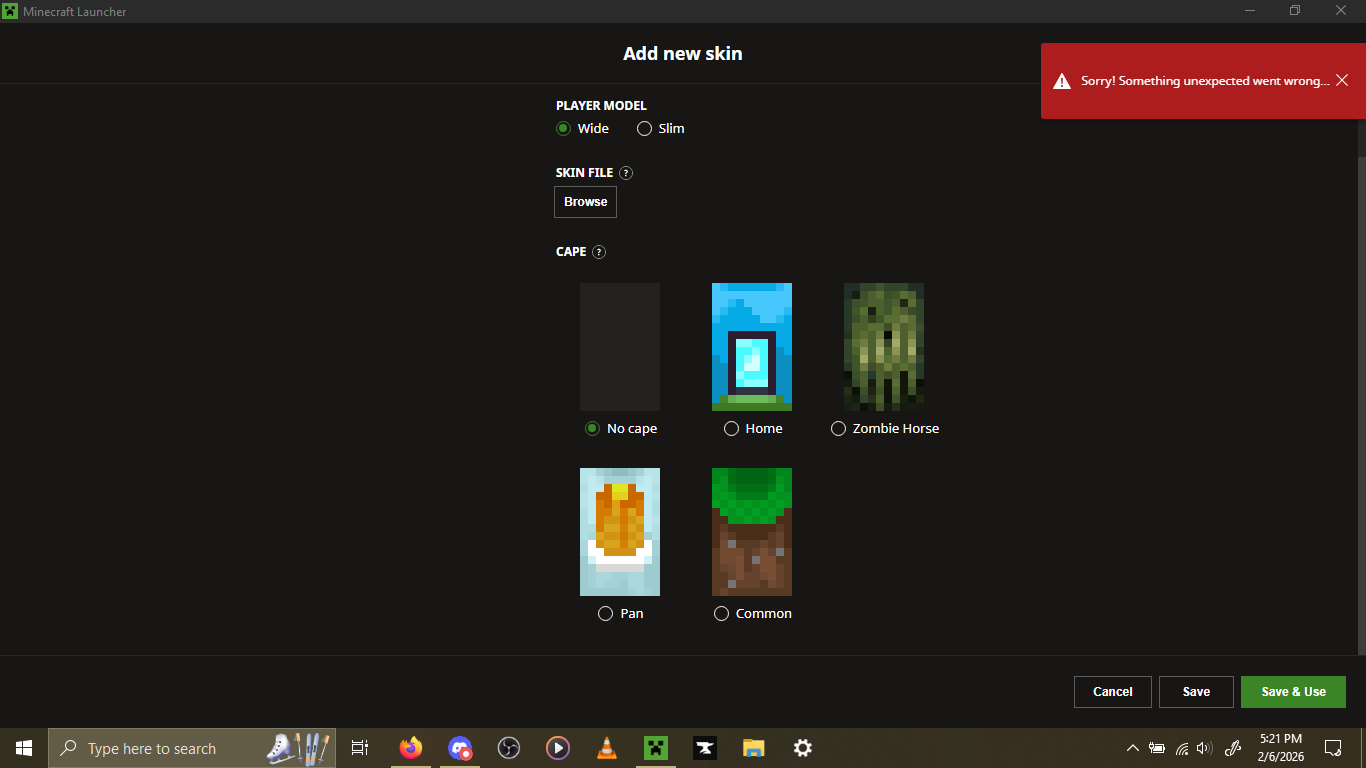 I have reinstalled the launcher twice now, and when I go to the Java “skins” tab I cannot see the skin that I am wearing, and I cannot add it to the list of saved skins.