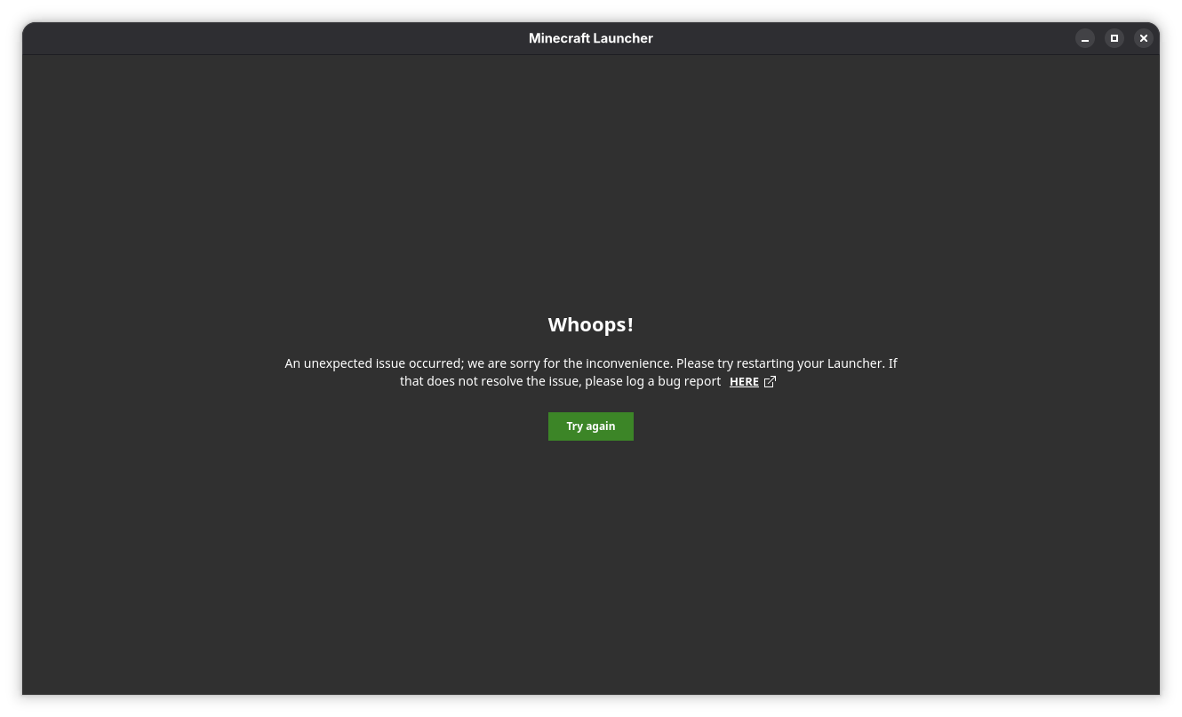 The launcher was working fine a few minutes before this started happening. The loading screen appears and an animation plays for some seconds, then it stops and says an unexpected issue occured. I tried restarting the launcher, restarting the computer and reinstalling the launcher.