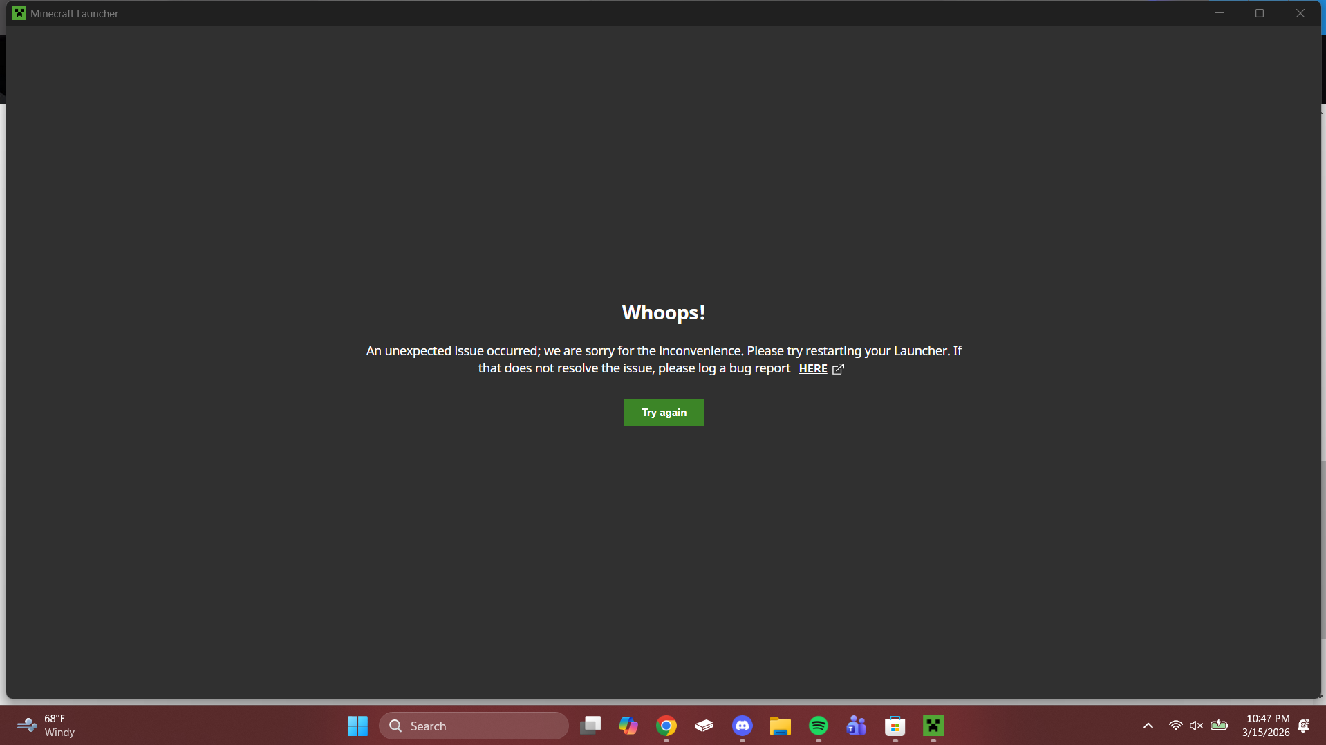 Whoop! An unexpected issue occurred; we are sorry for the incipience. Please try restarting your Launcher. If that does not resolve the issue, please log a bug repot HERE.
