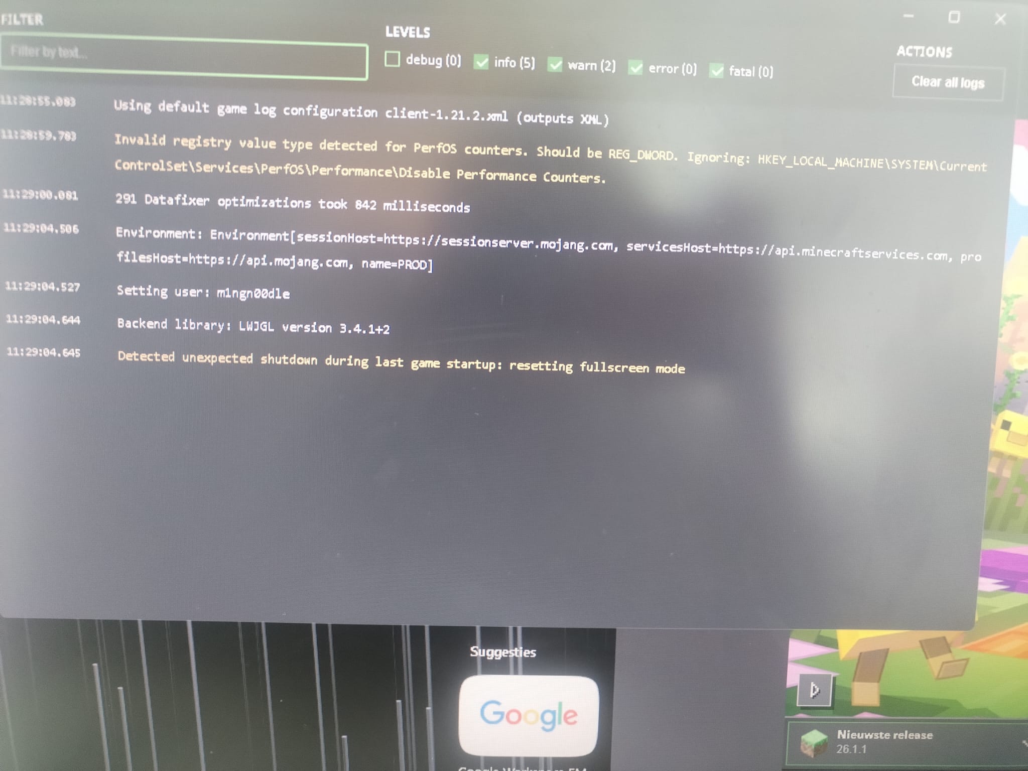 I cant open minecraft java edition. if i try to open it it will not show anything and if i try again it says that im already in. when Iopen minecraft game output i get this warning:Detected unexpected shutdown during last game startup: resetting fullscreen mode.
