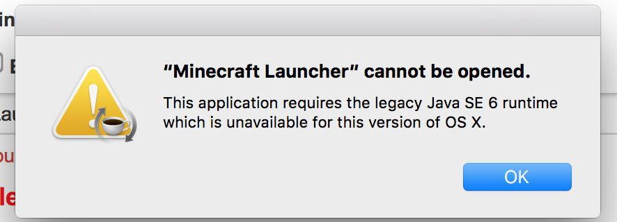 System level dialogue appears reporting "This application requires the legacy Java SE 6 runtime which is unavailable for this version of OS X."