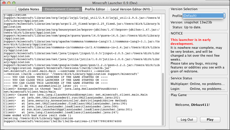 Upgraded to 0.9 Dev Launcher after using 0.8.whateverTheLastVersionWas. Minecraft does not launch. Edited default profile to force it to use a version of Minecraft that I know had been downloaded by the previous version of Dev Launcher, and that shows a status of "Up to date" in the Version Selection area of the GUI. Still will not launch. Service status shows "Online, no problems" for both Multiplayer and Login. Attempting to run Minecraft results in...