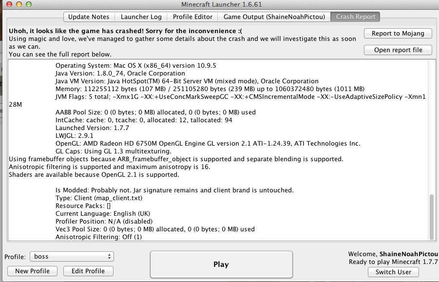 [minecraft/crash-reports/crash-<DATE>-client.txt|http://hopper.minecraft.net/help/finding-minecraft-data-folder]). Please attach it to this ticket so that we can diagnose your issue.For technical support please use the Mojang Support Center.
