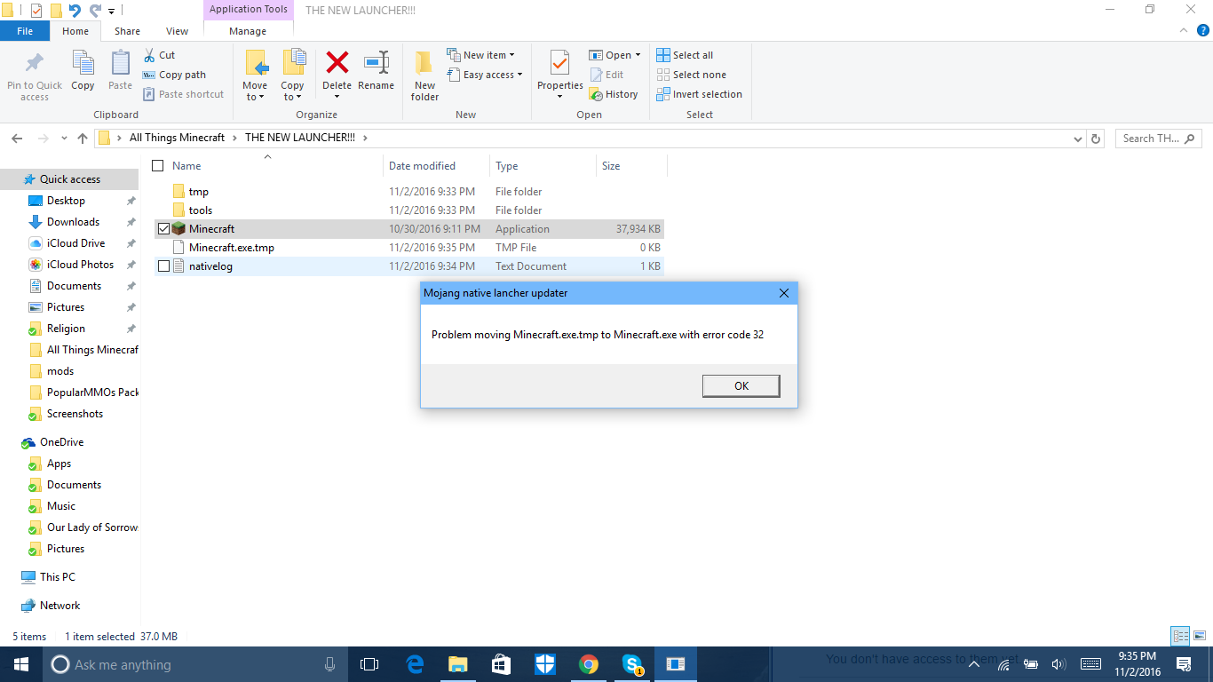 My Minecraft will not load. Please help! It says: Problem moving Minecraft.exe.tmp to Minecraft.exe with error code 32. I have used the launcher before and is only saying this now. It will not let me open the launcher. When I deleted the launcher then downloaded it again, it said: Unable to start the Minecraft Runtime Environment. This is most likely caused by a corruption. Please try to reinstall Minecraft. When I downloaded the new launcher AGAIN, it said the same thing.