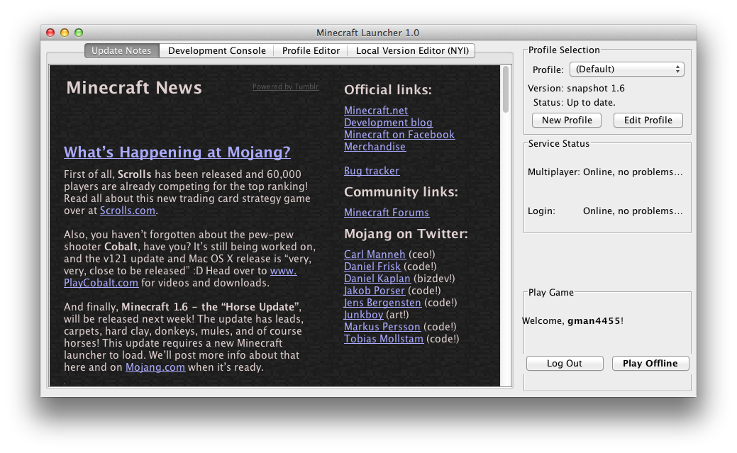 Just a small issue that triggered my OCD, on the launcher where it displays the version it reads "Version: snapshot 1.6", as opposed to "version 1.6". I don't know if that's what was intended, but if it wasn't, here you go.